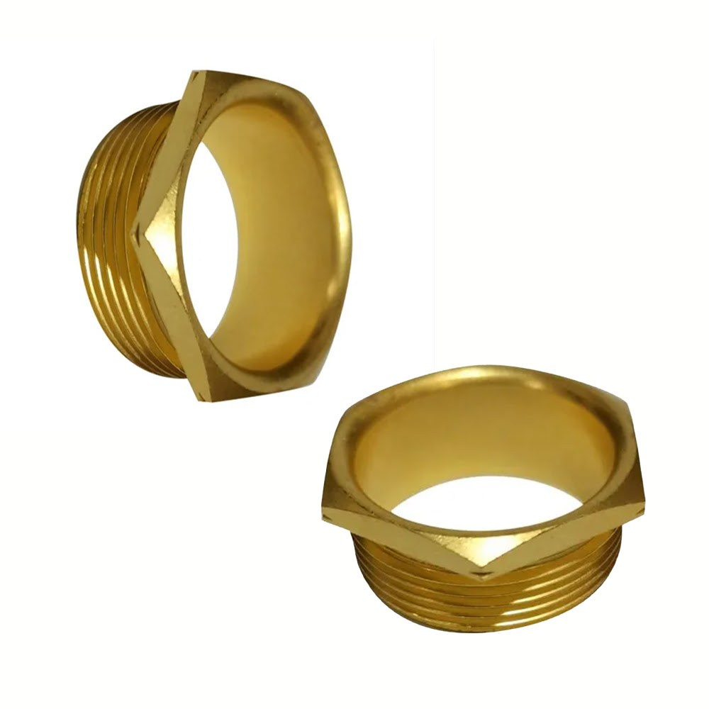 A brass male threaded bush with a smooth rounded interior profile. The bushes are used to protect cabling as it exits a female threaded conduit fitting.
